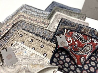 イタリア・アレッツォの職人たちが、一枚一枚、手仕事の温もりとともに仕立てたポケットチーフ。