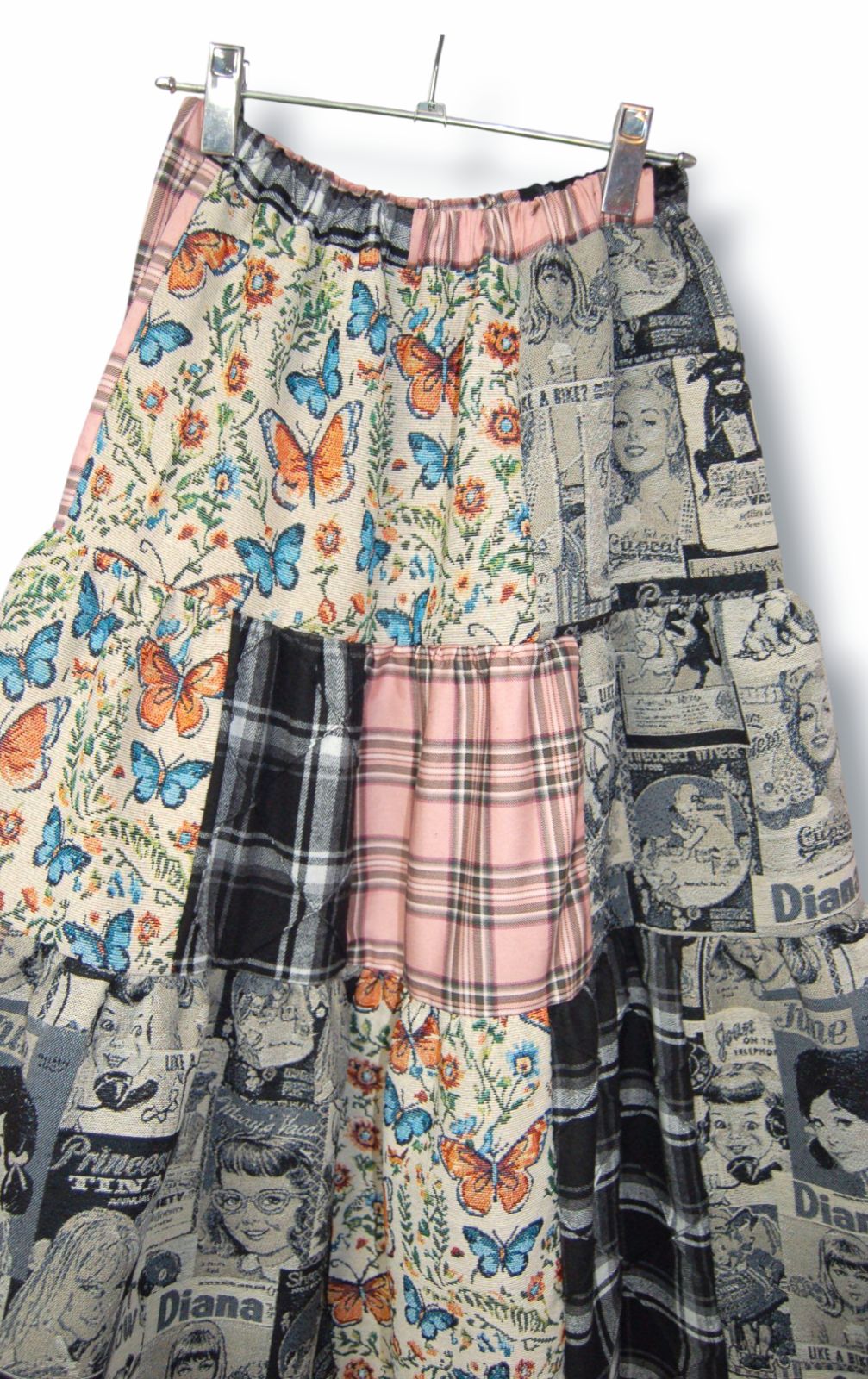 レトロマガジン×蝶々ゴブラン織りとピンクとピンタックデザインのタータンチェックをミックスしたティアードロングスカート。