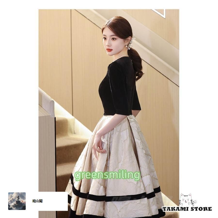 ドレス ミモレ丈 ひざ丈ドレス 演奏会 ピアノ 発表会 5分袖付き スエード Aライン ファスナー フェミニン 大人 母親 結婚式 体型カバー 謝WP 104