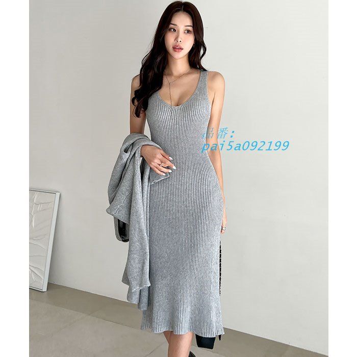 長袖カーディガン付き ノースリーブロングタイトニットワンピース グレー レディース おしゃれ デート 上品 大人 韓国 pai 5 a 092199
