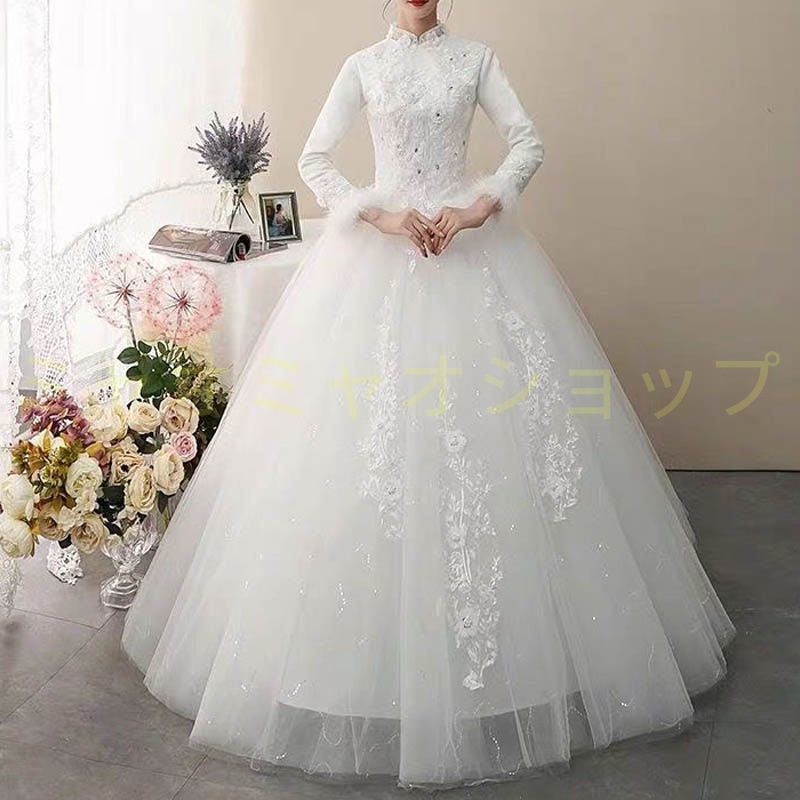 ウエディングドレス 結婚式 長袖 プリンセス 花嫁 ドレス 白 披露宴 ロングドレス ブライダル 姫系 襟付き チャイナ 刺繍 大きいサイズ 編み上げ 1216