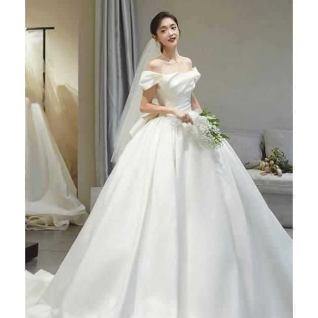 ウェディングドレス 二次会 結婚式 ブライダル Aラインドレス サテン オフショルダー 前撮り 挙式 花嫁 ウエディングドレス リボン プリン