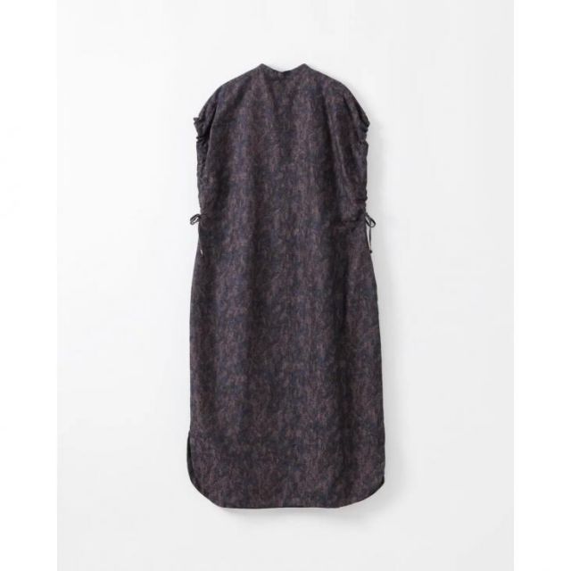 生地の程よい厚みと柔らかさを活かしノースリーブの袖口にギャザーを寄せ、お花の蕾のような柔らかいシルエットのワンピースを作りました。ギャザーの引っ張り具合でシルエットの印象を変えることが出来ます。