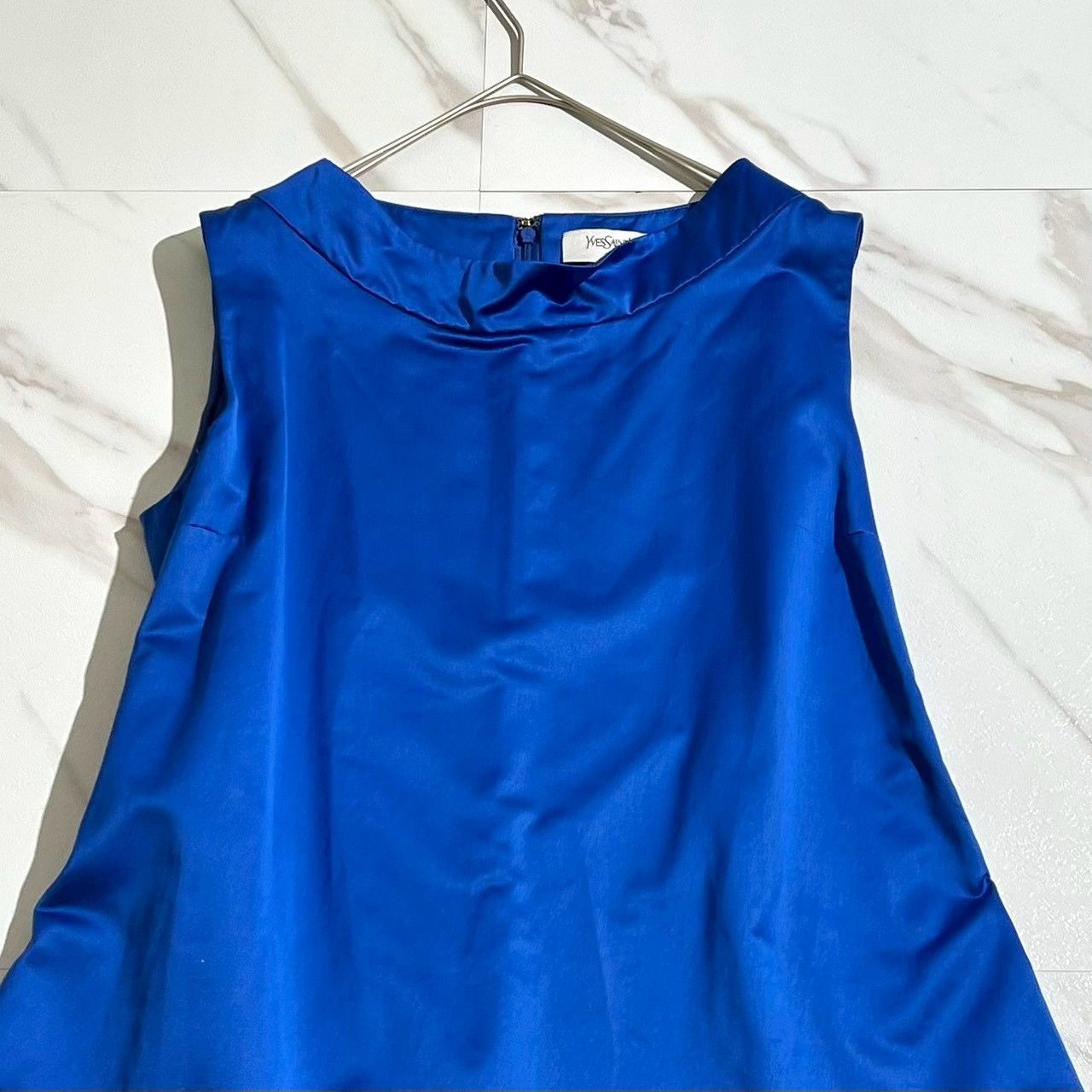 品 Yves Saint Laurent イヴサンローラン フェザーデザインドレス ノースリーブワンピース 羽根 バックジップ 青 ブルー フランス製 コットン 綿 ポリエステル オールシーズン パーティードレス 結婚式 フォーマル 二次会