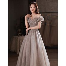 軽やかなチュール生地がふんわりと広がり、動くたびに優雅な印象を演出します。オフショルダー仕様でデコルテラインを美しく見せつつ、グリッター刺繍が華やかな輝きをプラス。長時間の着用でも快適な着心地で、フォトウェディングやパーティーシーンにも最適です。