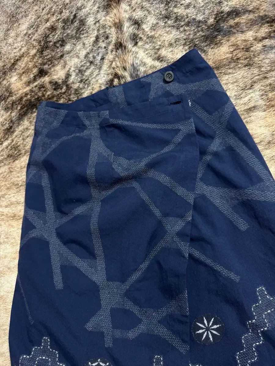 刺し子の刺しゅう模様、しっかりとしたネックディテール、軽くてしなやかな手作りのテキスタイル