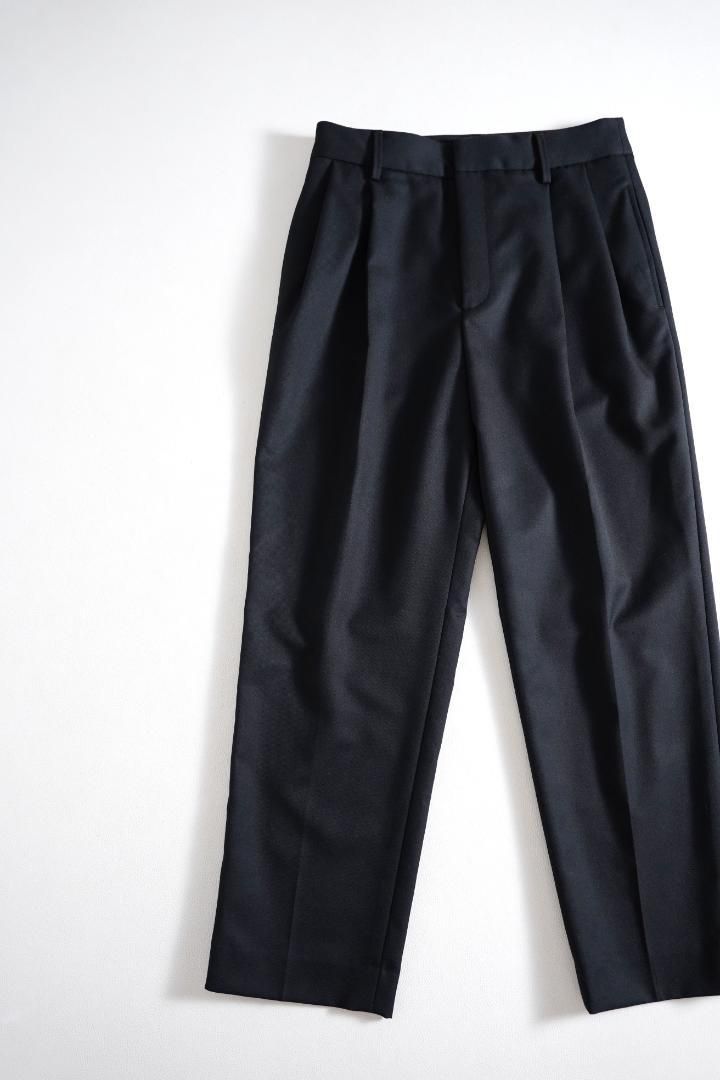 少し高めのウエスト位置で股上も深く、後ろポケットも高めについているため視覚的に腰位置が高く見えスマートな印象のウールパンツです。
