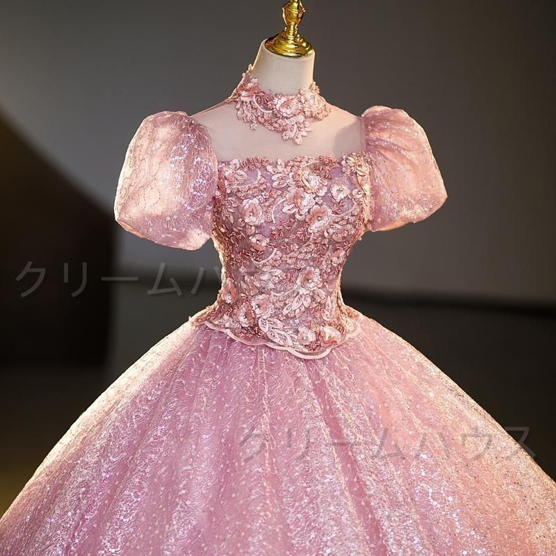 カラードレス 編み上げ ピンク パフスリーブ ロングドレス 結婚式 二次会 発表会 演奏会 ウェディングドレス ウエディングドレス 前撮り プリンセスドレス