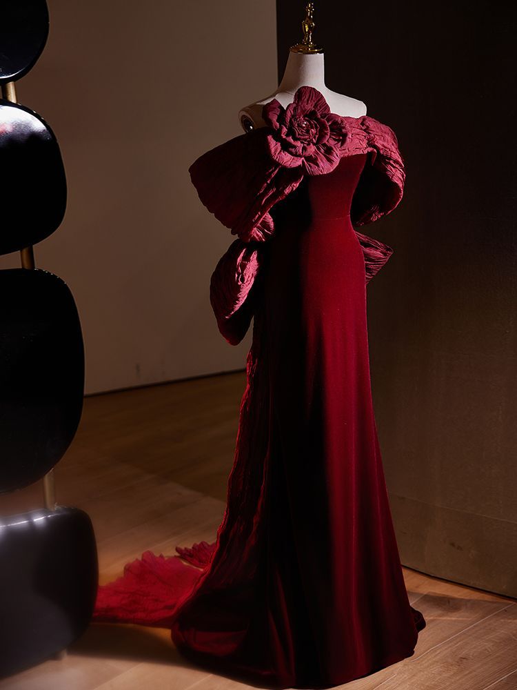 上品なワインレッドカラーのベルベットロングドレスです。一字肩デザインで肩周りを美しく見せ、魚尾シルエットで女性らしい優雅さを引き立てます。結婚式や婚約パーティー、披露宴、フォーマルなパーティーなど、特別なシーンに最適な一着です。