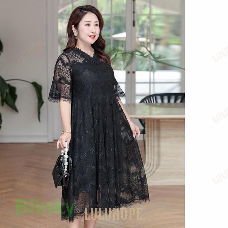 パーティードレス 大きいサイズ 5 l 6 7 8 9 結婚式ワンピース 袖あり ミモレ丈 半袖 総レース Vネック 黒 謝恩会 同窓会 発表会