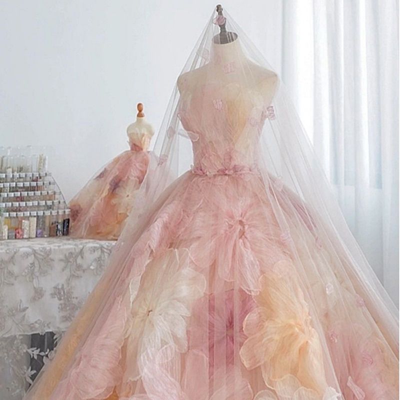 フラワーボリュームドレス ピンク ベージュ M オーガンジー 花びらデザイン チュールドレス 結婚式 前撮り 二次会 披露宴 ロケーション撮影 ドレス 春夏 花嫁 Aライン pipsセレクト